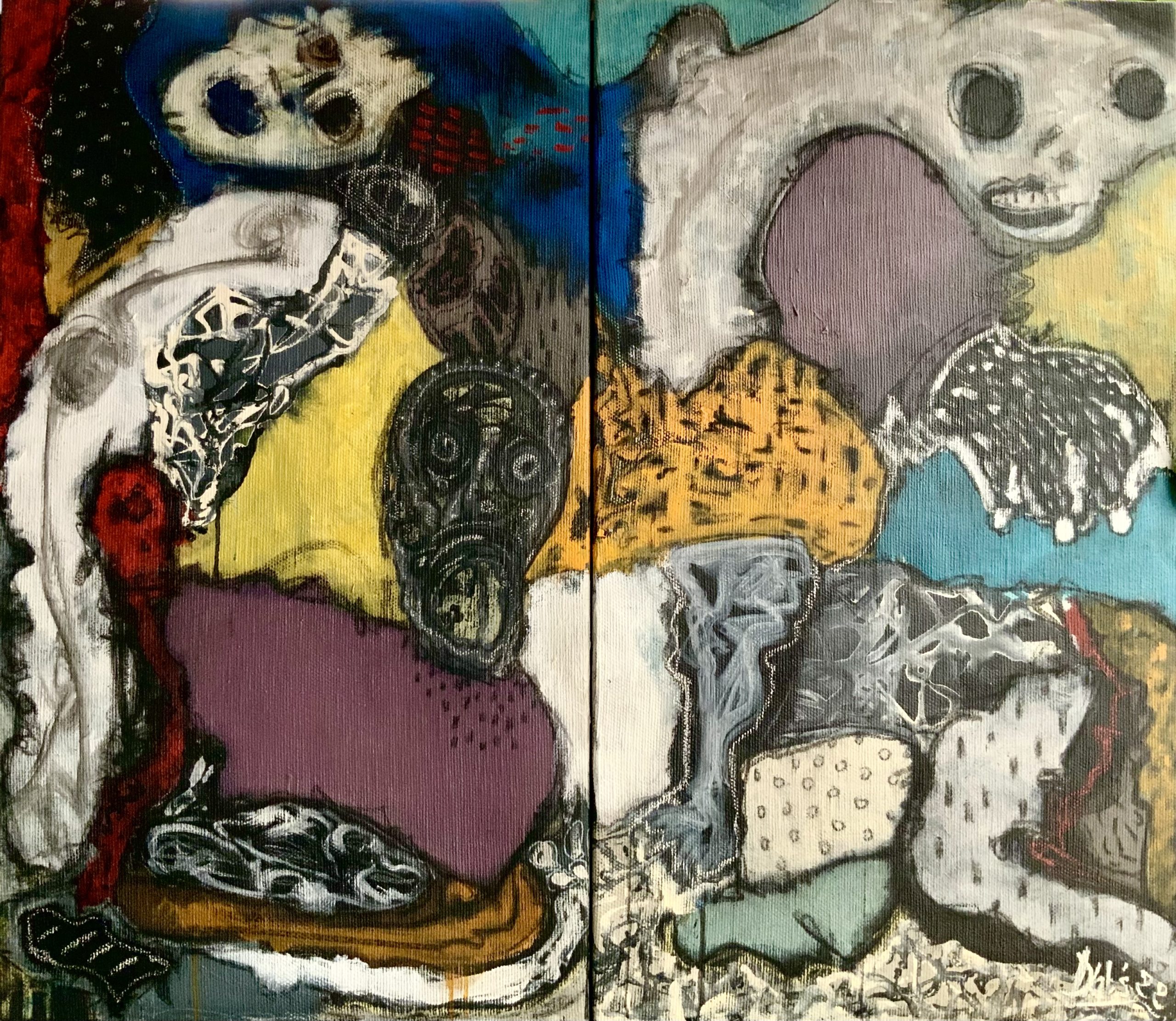 Les œuvres d’Ibrahima Cissé dit Deb’s sont une invitation au voyage vers un autre réel. Leurs personnages aux silhouettes atomisées et aux visages déformés sont des exorcismes picturaux.