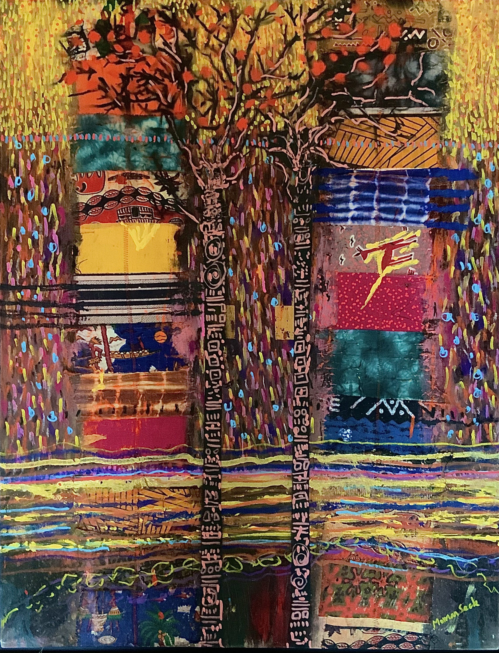 L’unité dans la diversité. Momar Seck décrit ses créations comme des unités plurielles. Ses toiles et ses sculptures sont issues d’assemblage de matériaux divers comme autant de métaphores de la diversité du monde et de l’humain. Une palette colorée rehaussée d’incrustations dont des bouts d’étoffe et autres fragments qui ont, eux aussi, leur histoire. La variété des textures et des couleurs font de chaque création un symbole à la fois d’union et d’interdépendance fragile: une diversité qui ne tient qu’à un fil et pourtant est une force. Chaque œuvre apparait comme « une diversité singulière.