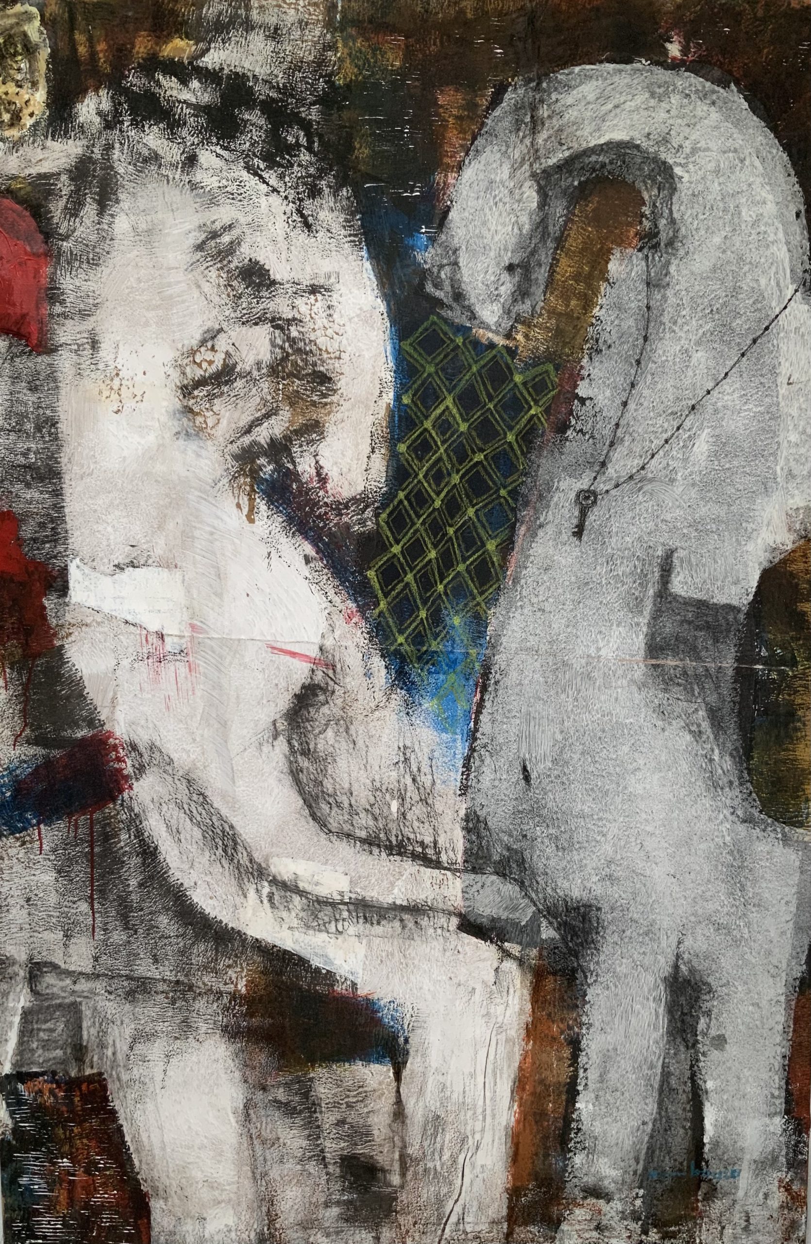 Les œuvres de Sambou Diouf sont une invitation au voyage vers un autre réel. Leurs personnages aux silhouettes atomisées et aux visages déformés sont des exorcismes picturaux.