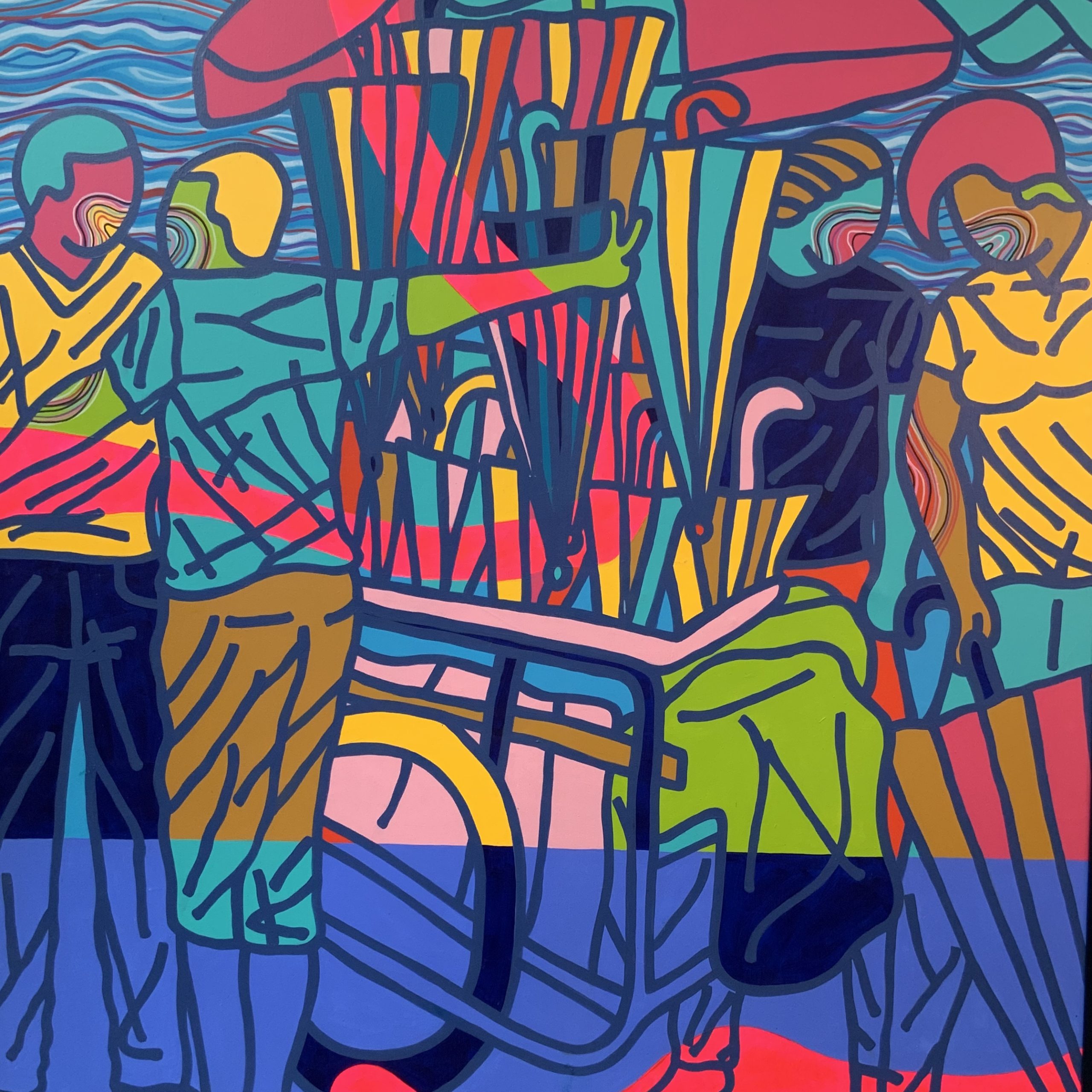 L’utilisation des lignes et de ses couleurs vives créent une immersion visuelle immédiate. Enfin, le parti pris de l’artiste est de présenter systématiquement ces scènes de face invitant le spectateur à faire partie du même espace physique.