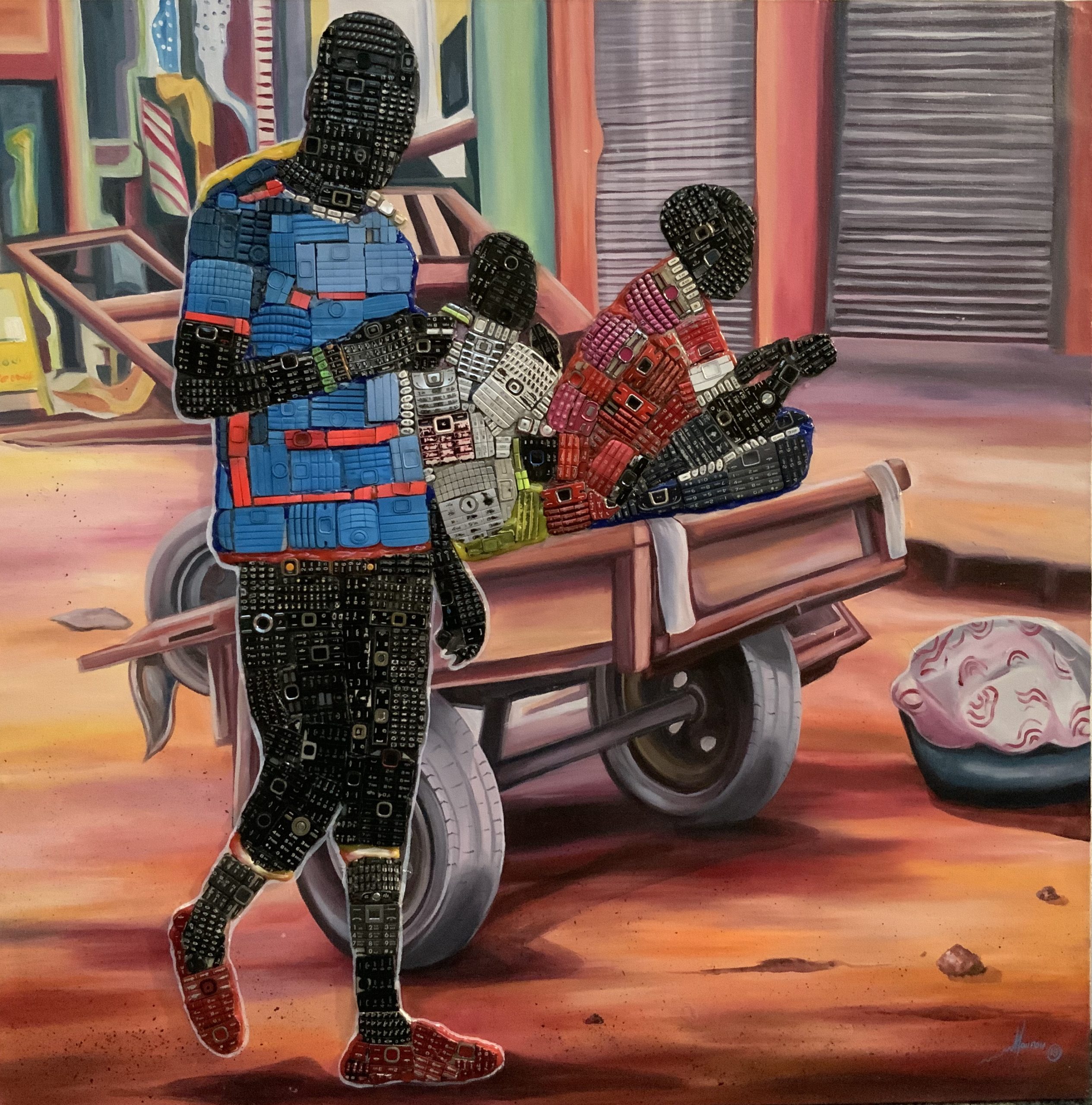 « Dans mes toiles, les êtres humains sont constitués de claviers car l’outil informatique prend actuellement le dessus sur notre humanité »déclare Mounou.