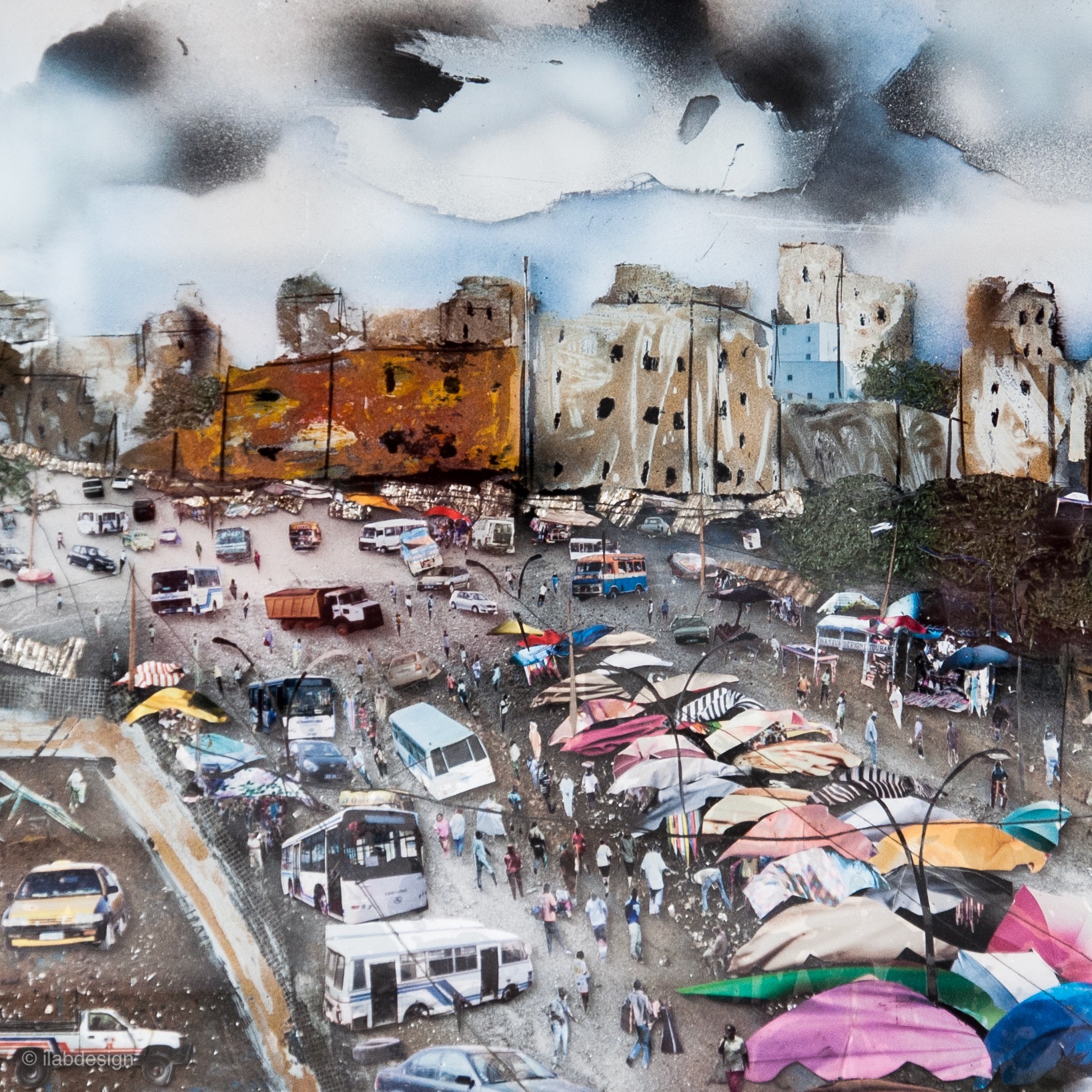FALLY Sene artiste sénégalais utilise sa technique de prédilection la peinture et les collages sous verre.