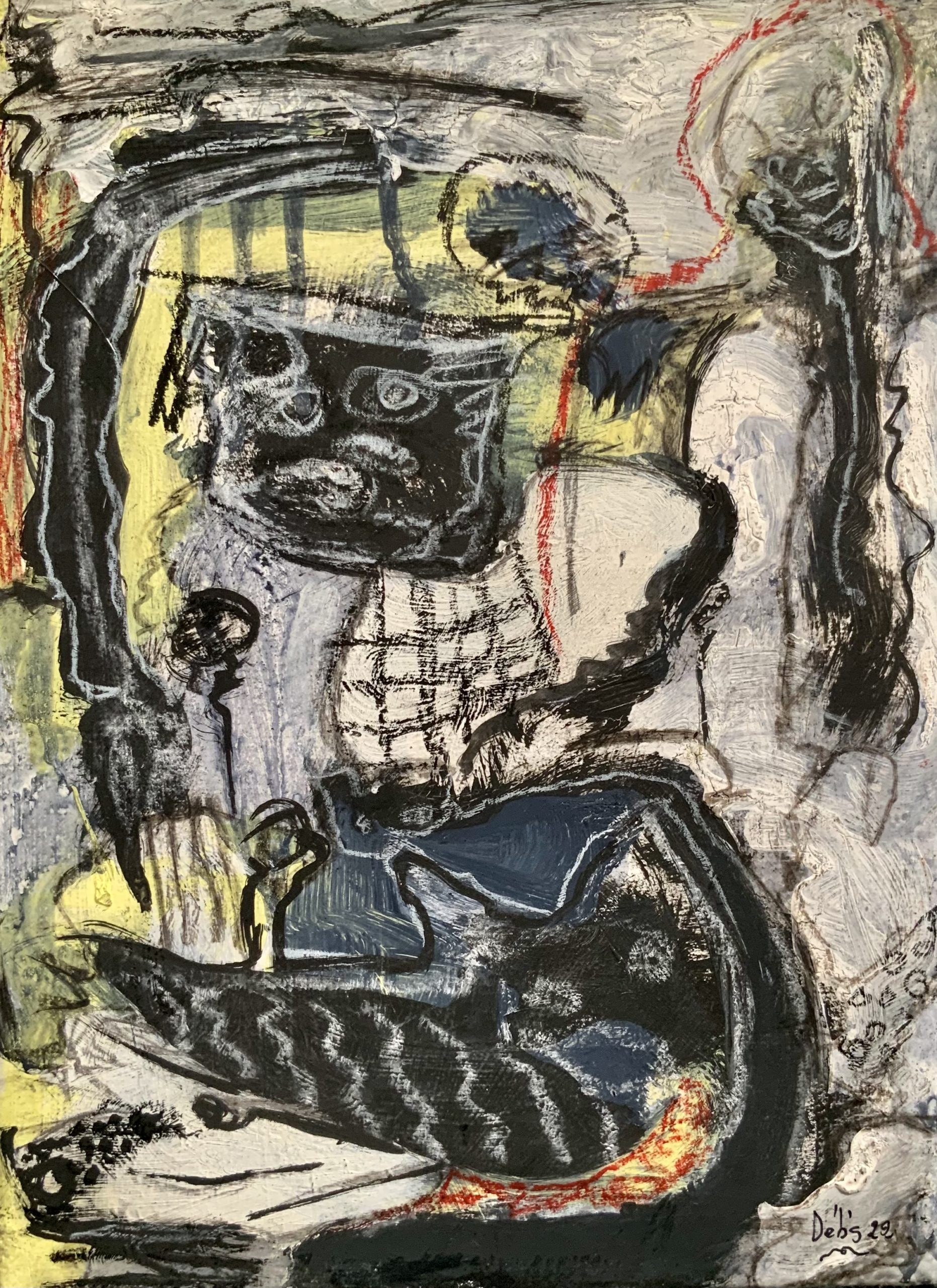 Les œuvres d’Ibrahima Cissé dit Deb’s sont une invitation au voyage vers un autre réel. Leurs personnages aux silhouettes atomisées et aux visages déformés sont des exorcismes picturaux.