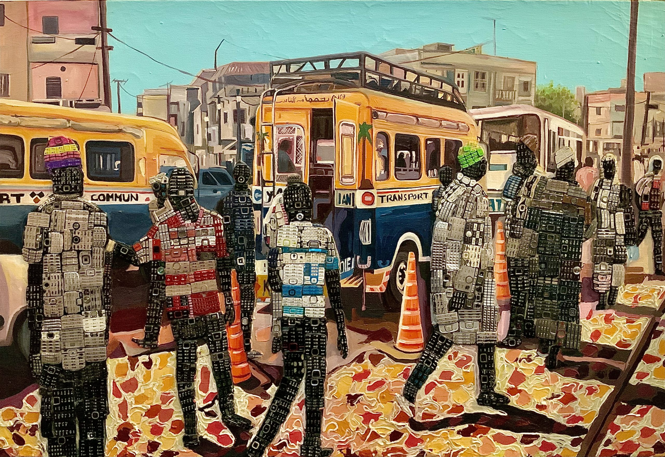 « Dans mes toiles, les êtres humains sont constitués de claviers car l’outil informatique prend actuellement le dessus sur notre humanité »déclare Mounou.»